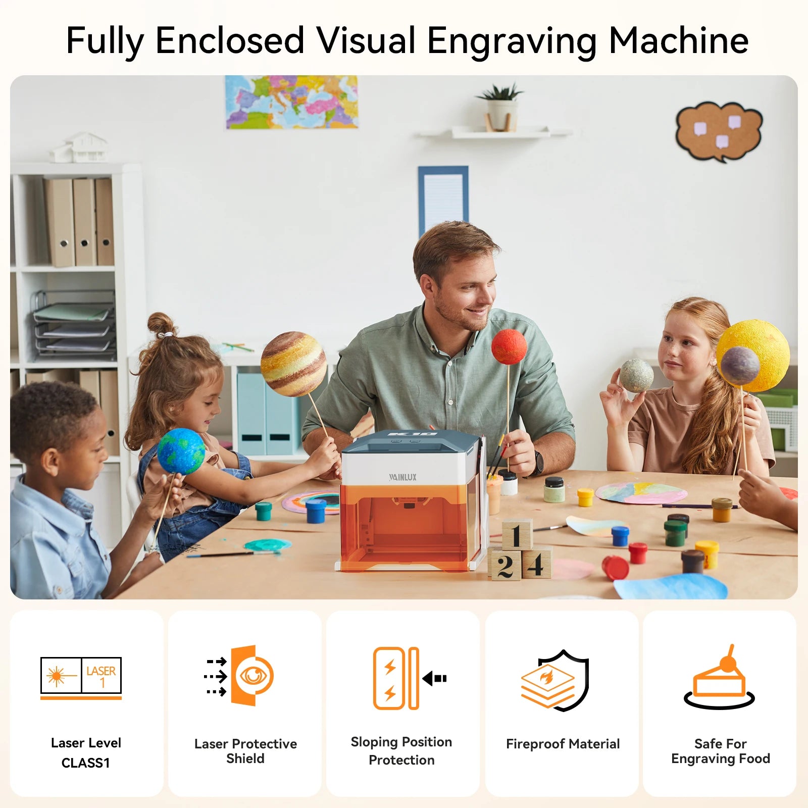 The WAINLUX K10 Mini Laser Engraver is the perfect entry-level machine for DIY hobbyists, crafters, and small-scale woodworking projects, combining a compact design with professional-grade safety and precision. This 3000mW (3W) desktop engraver features a fully enclosed structure and is FDA certified Laser Level CLASS 1, with an automatic shut-off safety mechanism if the protective shield is opened or the machine is tilted.