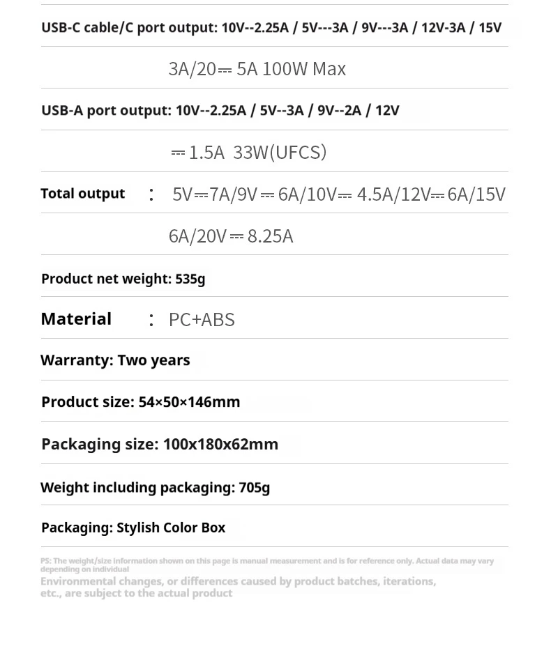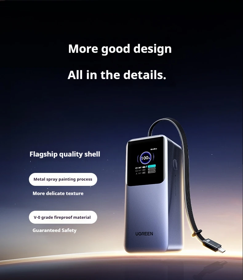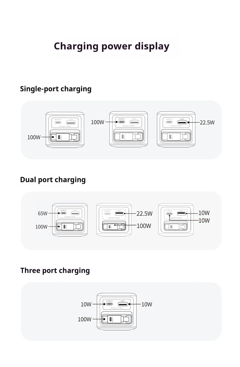 - Triple High-Speed Ports: Offers three dedicated output ports (2x USB-C + 1x USB-A) plus the built-in cable, with the main USB-C outputs supporting up to 100W PD individually.