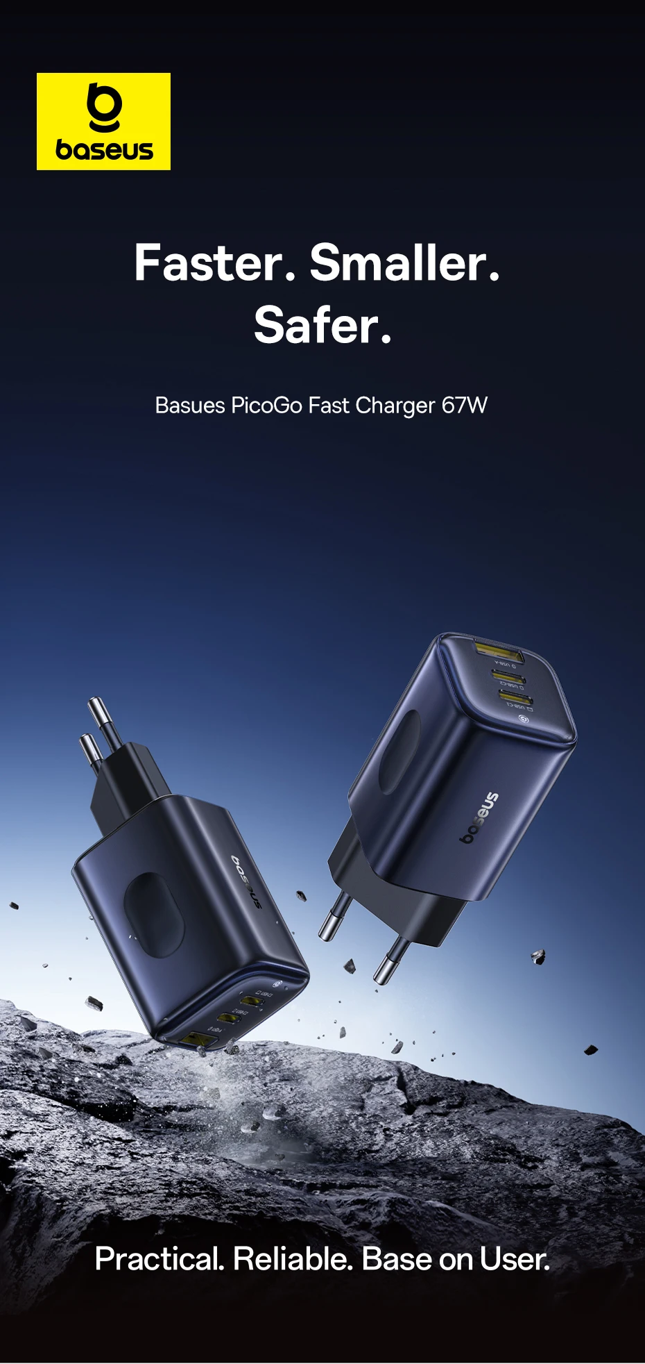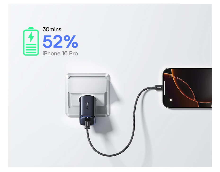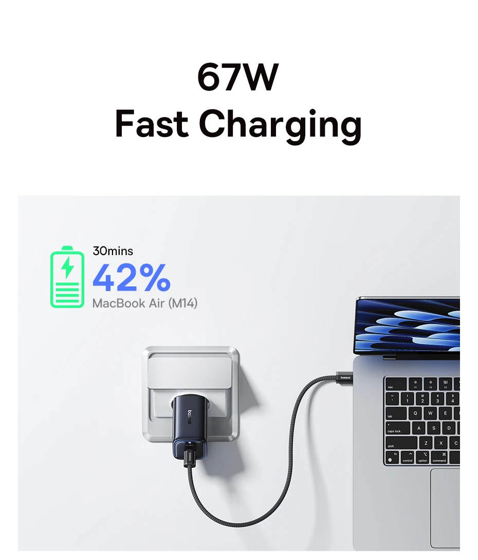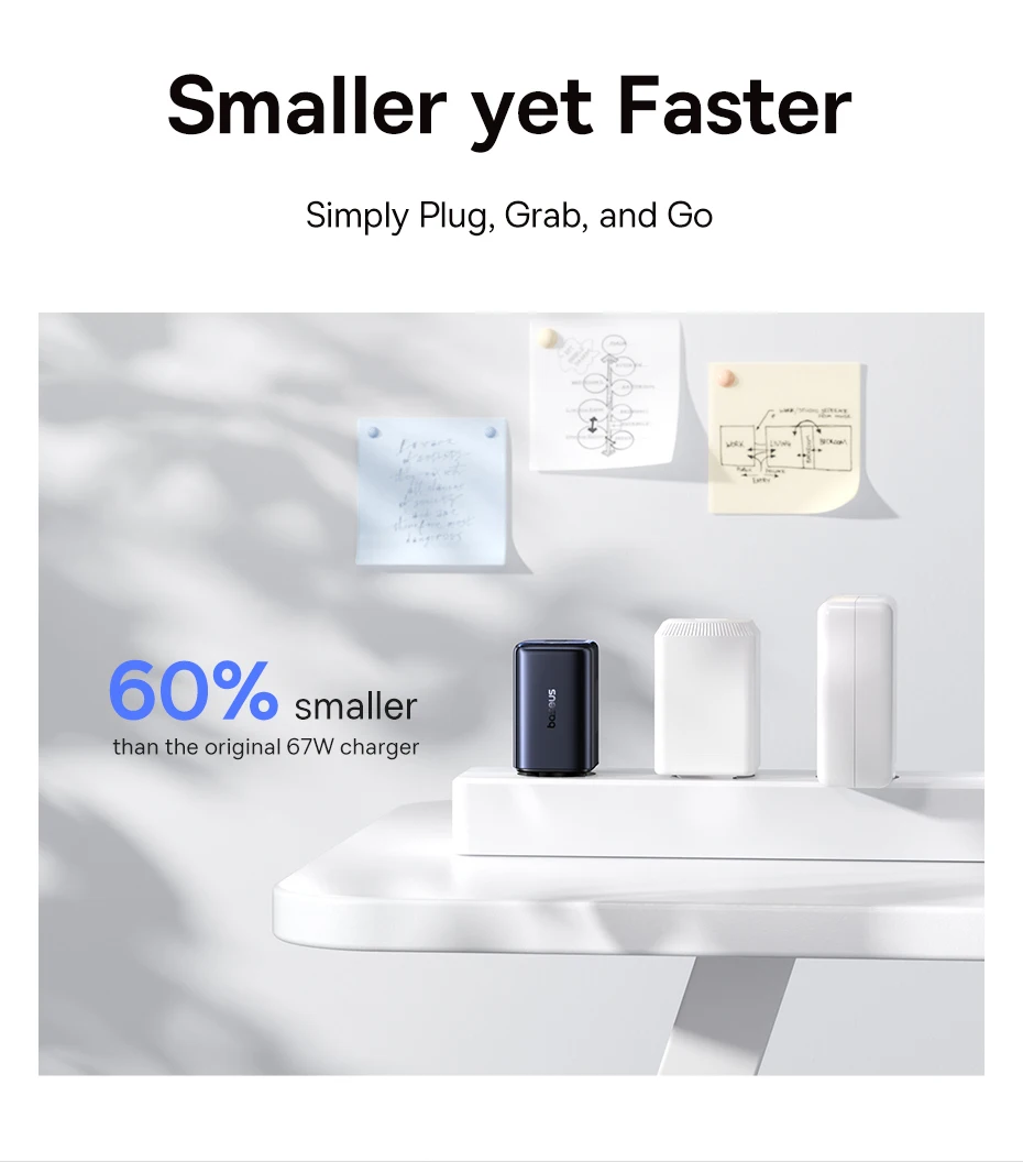 Introducing the Baseus Picogo 67W Fast Charger, redefining portability and power. Engineered with advanced GaN technology and a unique "Pocket IN" stacking design, the Picogo is up to 60 percent smaller than traditional 67W chargers, making it the ultimate travel companion for your entire tech ecosystem.