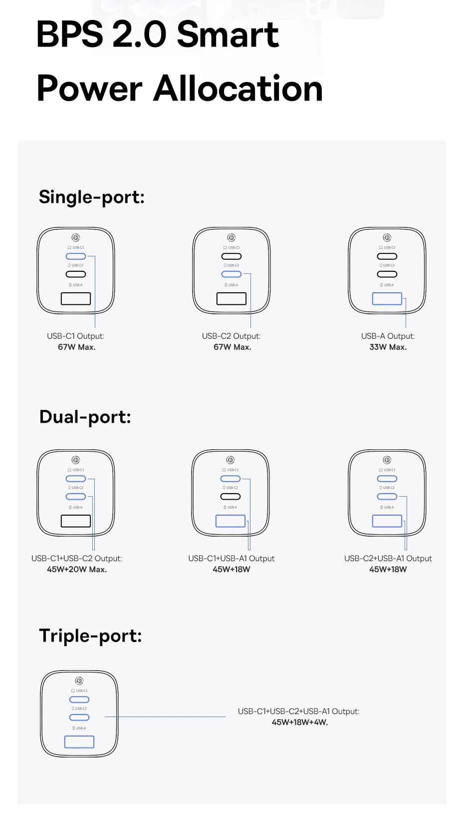- Charge 3 Devices Simultaneously: Features two USB-C ports and one USB-A port, allowing you to power your laptop, phone, and earbuds at once using smart power allocation (BPS 2.0).