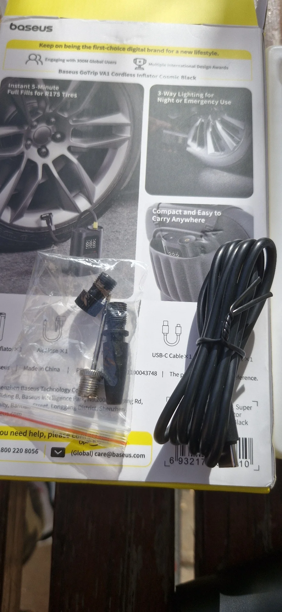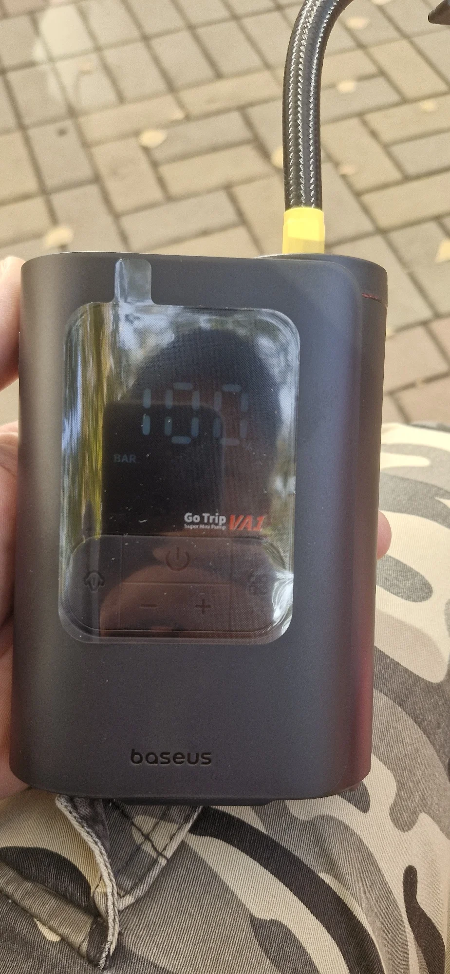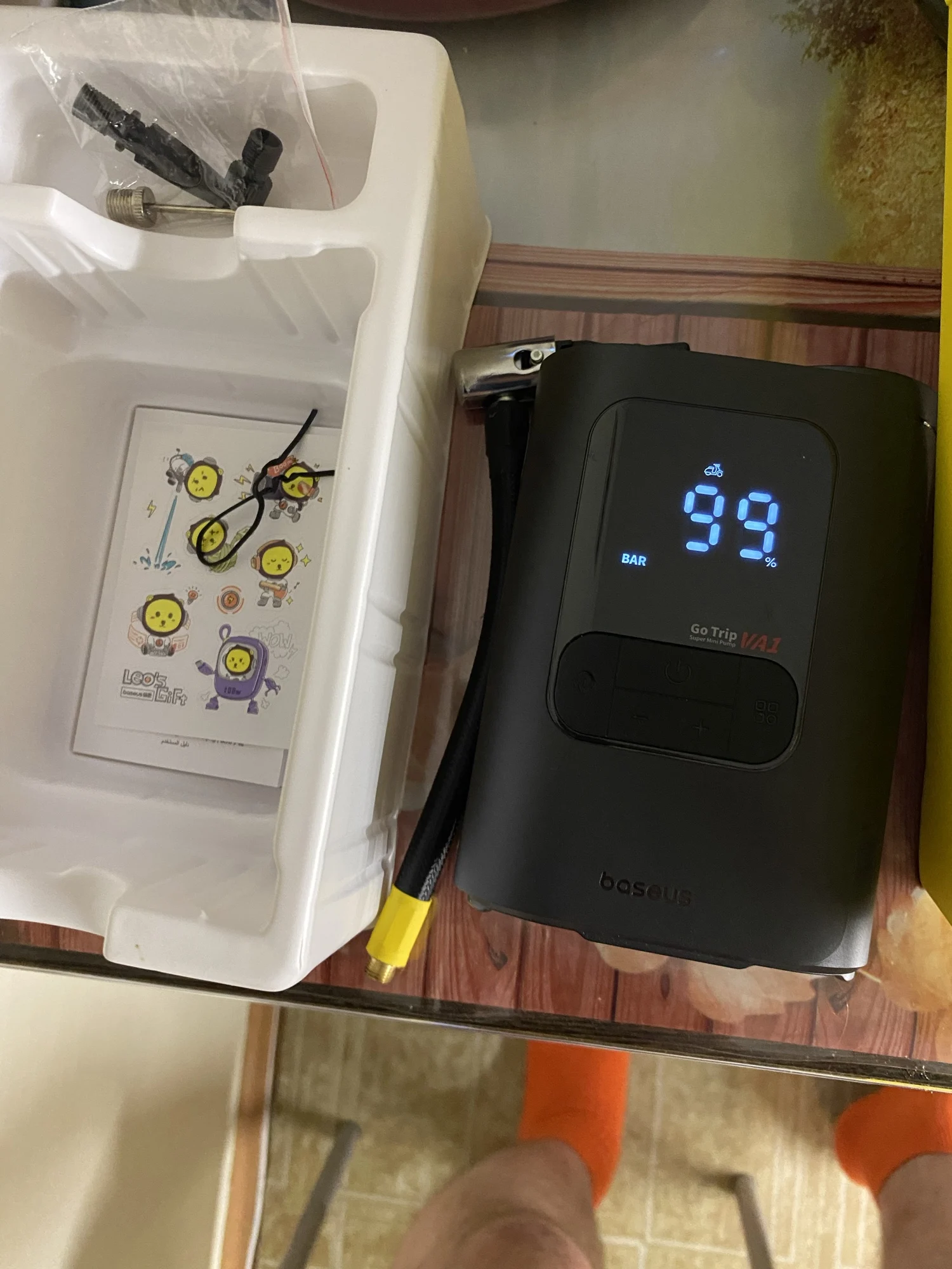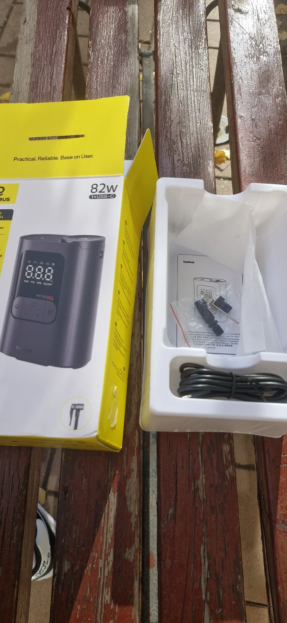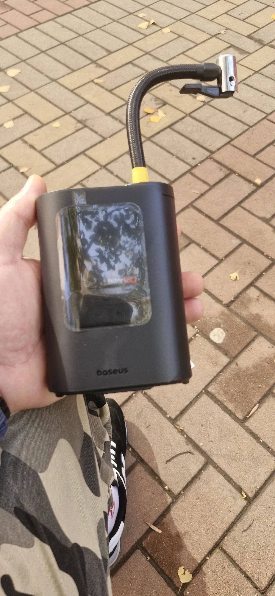 Delivered in 4 days! Everything works perfectly! Battery 99%. Respect to the seller! The package includes a compressor, charging cable, hose, 3 nozzles, and instructions.