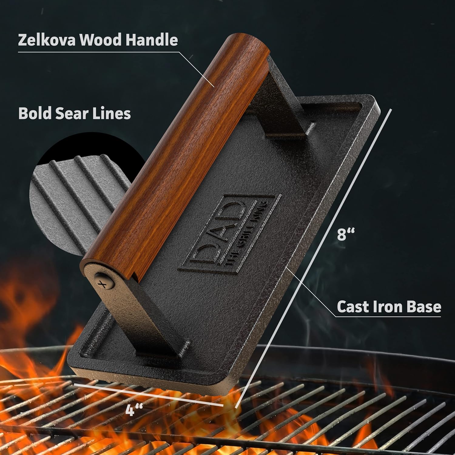 Give the gift of perfectly cooked food! The Soho "Dad The Grill King" Grill Press is the heavy-duty tool every barbecue master needs. Made from pre-seasoned cast iron with a comfortable wood handle, this press ensures faster, more even cooking and those coveted bold grill marks.