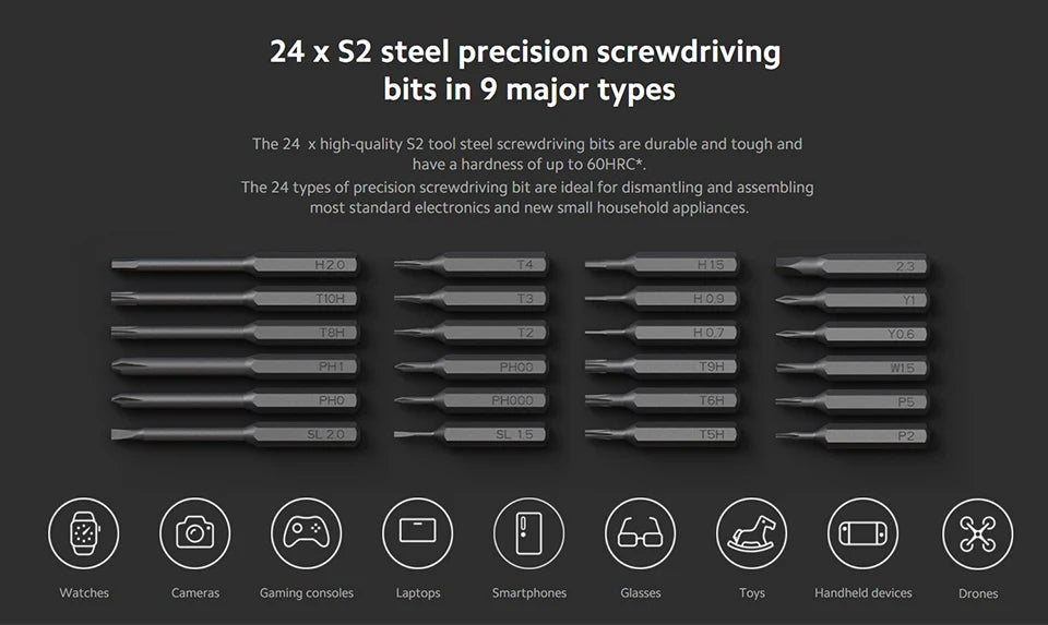- Versatile Bit Selection: 24 S2 steel bits (60HRC) in 9 types, including 6 extended 45mm bits.